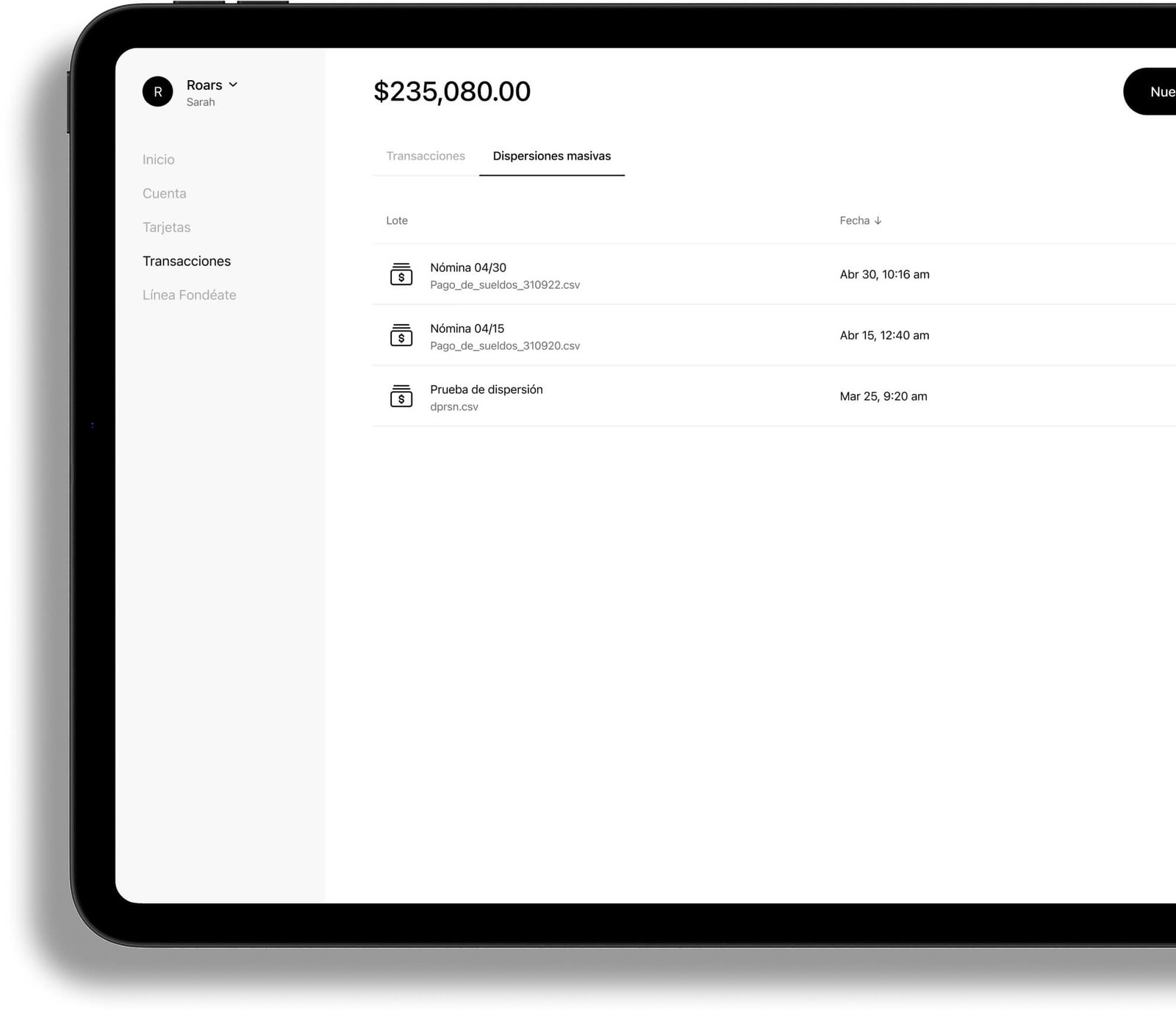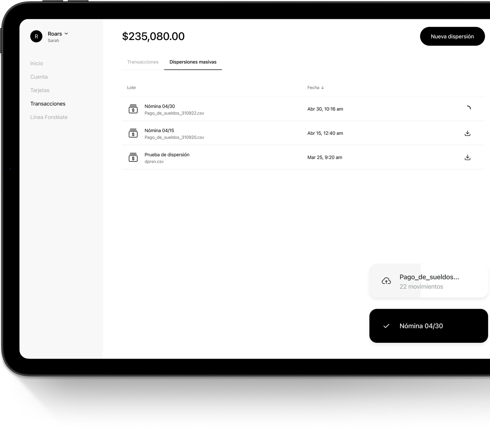 Realiza transferencias individuales al instante o haz pagos masivos con tan solo cargar un .csv.